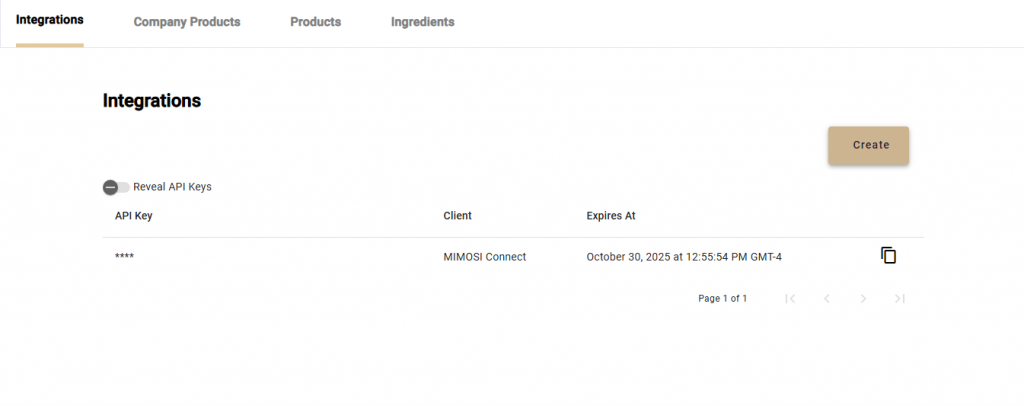 Navigate to the Integrations page from the navbar. On this page, there is a listing of all the current, active integrations with their “API Keys”, “Clients” and “Expiry Dates”. To create a new integration, select [+ Create].
