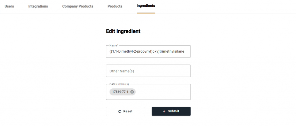 Navigate to the Ingredients page from the navbar. On this page, there is a listing of all the ingredients in the EcoChem database. Edit a specific ingredient by selecting the [Edit] button for a particular ingredient.