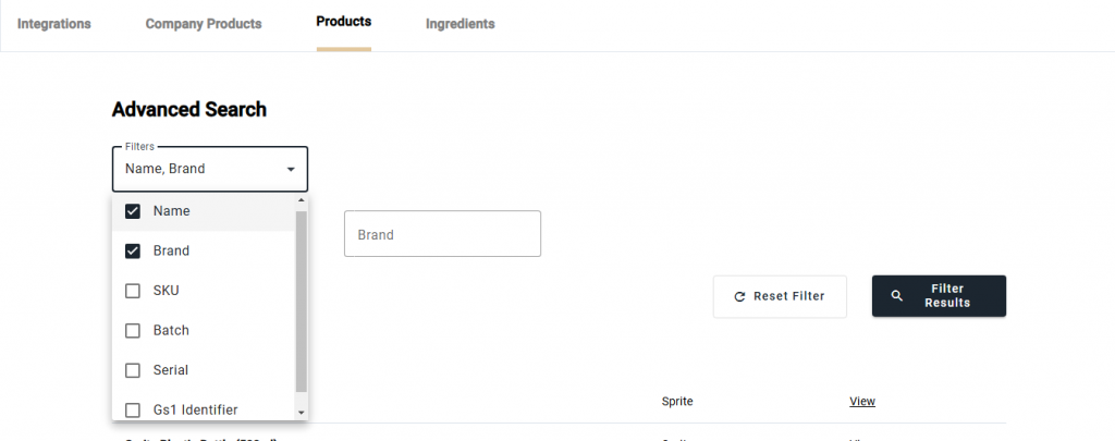 To search for a specific product, select the filters by which you prefer to search for the product. There are 6 filters to choose from, with “Name” and “Brand” being the default filters. Populate the filters for the product. You can then select [Filter Results]. The product being searched will appear in the list.