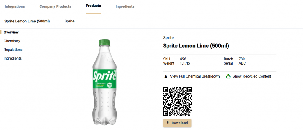 To see the general overview of a product at a company, navigate to the Company Products page and select [View] for a particular product. The product Overview page will then appear where the user will be able to see general information about the product, whether the product has full ingredient disclosure or not, as well as view a picture of the product.
